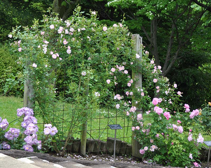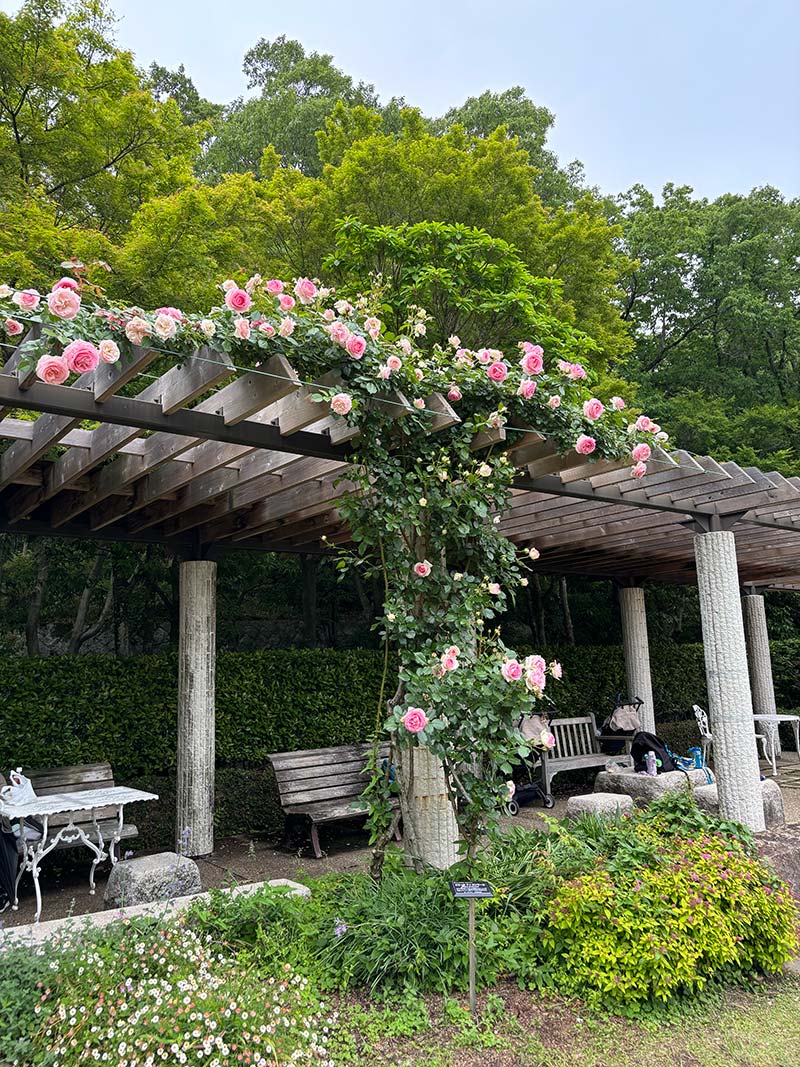 バラ園の区画には、色とりどりのバラがちょうど咲きそろっていて、思わず足を止めてしまうほどの華やかさ。